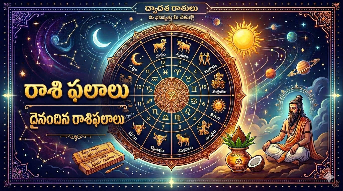 ఈ రాశి ఫలాలు చిత్రం వేద జ్యోతిష్య శాస్త్ర గొప్పతనాన్ని ప్రతిబింబిస్తుంది. ఇందులో ద్వాదశ రాశుల చక్రం, గ్రహ గతులు, ధ్యాన ముద్రలో ఉన్న మహర్షి మరియు పురాతన తాళపత్ర గ్రంథాలను చూడవచ్చు. ఇది మీ దైనందిన భవిష్యత్తును మరియు గ్రహాల ప్రభావాన్ని వివరించే ఒక సంపూర్ణ జ్యోతిష్య చిత్రం.