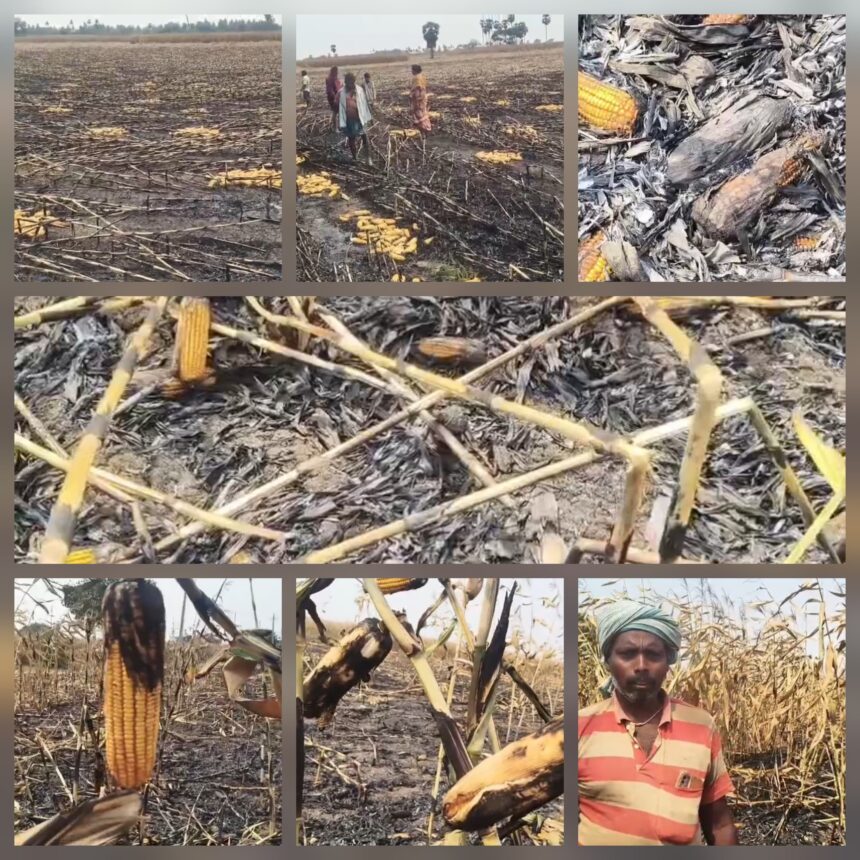 గుంటూరు జిల్లా దుగ్గిరాల మండలం చిన్నపాలెం గ్రామంలో దారుణం చోటుచేసుకుంది. షార్ట్ సర్క్యూట్ కారణంగా 14 ఎకరాలు మొక్కజొన్న పంట పూర్తిగా దగ్ధమైంది.పదిమంది రైతులు ఒక్కొక్కరు ఎకరన్నర , రెండు ఎకరాలు చొప్పున మొక్కజొన్న సాగు చేశారు. మొక్కజొన్న సాగు కి ఎకరానికి 50,000 నుండి 60,000 దాకా పెట్టుబడి అయింది. అయితే కరెంట్ వైర్లు షార్ట్ సర్క్యూట్ అవ్వడం వల్ల తెగి క్రిందనున్న మొక్కజొన్న పంటపై పడి మంటలు చెలరేగాయి.పంట మెత్తం దగ్దంమైనదని రైతులు ఆవేదన చెందుతున్నారు. ప్రభుత్వం వెంటనే స్పందించి నష్టపోయిన రైతులను ఆదుకోవాలని కోరారు.కేవలం లైన్మెన్ ఆలస్యం అసమర్థత వల్లే ఈ కరెంటు వైర్లు కిందపడి షార్ట్ సర్క్యూట్ సంబంధించినది అని రైతులు తెలిపారు.స్థానిక రైతులు దగ్గర నుంచి మోటార్ కి ఫీజు వేయాలంటే లైన్ మెన్ 200 నుంచి 500 రూపాయలు డిమాండ్ చేస్తున్నాడని చెప్పారు.గతంలో మోటర్లు బిగించడానికి ఒక రైతు దగ్గర నుంచి ఒక మోటార్కు 20 నుండి 40,000 వసూలు చేశాడని స్థానిక రైతులు ఆరోపించారు.