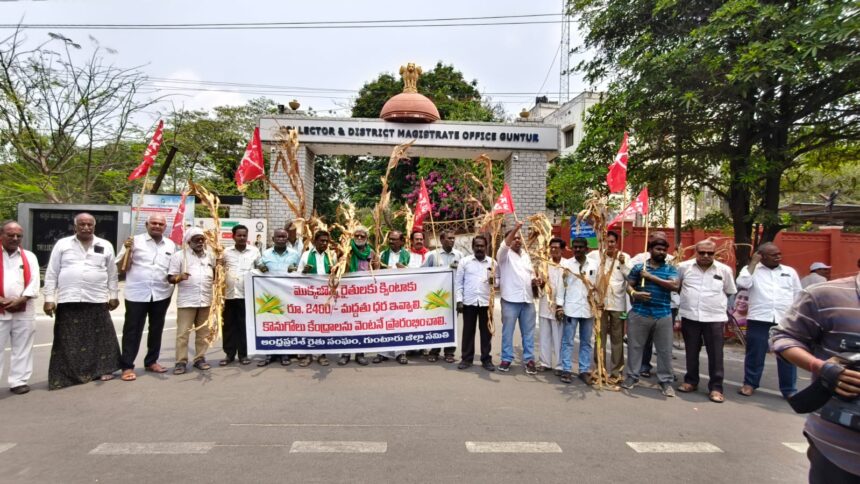 మొక్కజొన్నకు క్వింటాకు రూ.2,400 మద్దతు ధర ఇవ్వాలని డిమాండ్ చేస్తూ రైతులు గుంటూరు జిల్లా కలెక్టర్ కార్యాలయం వద్ద ఆందోళనకు దిగారు. కొనుగోలు కేంద్రాలు వెంటనే ప్రారంభించాలని కోరుతూ నిరసనగా తమ మొక్కజొన్న పంటలను తగలబెట్టారు.ఈ సందర్భంగా సిపిఐ జాతీయ కార్యవర్గ సభ్యులు ముప్పాళ్ళ నాగేశ్వరరావు, ఆంధ్రప్రదేశ్ రైతు సంఘం రాష్ట్ర ప్రధాన కార్యదర్శి కె వి వి ప్రసాద్ మాట్లాడుతూ, పెరిగిన ఖర్చుల కారణంగా రైతులకు లాభసాటి ధర అందడం లేదని ఆవేదన వ్యక్తం చేశారు. ఇతర రాష్ట్రాల్లో క్వింటాకు రూ.2,400 మద్దతు ధర అమలు చేస్తున్నప్పటికీ రాష్ట్ర ప్రభుత్వం చర్యలు తీసుకోకపోవడం అన్యాయమని విమర్శించారు.వెంటనే కొనుగోలు కేంద్రాలు ప్రారంభించి, ప్రతి రైతు పండించిన మొత్తం మొక్కజొన్నను కనీసం రూ.2,400 చొప్పున కొనుగోలు చేయాలని, ఇప్పటికే అమ్ముకున్న రైతులకు వ్యత్యాస ధర చెల్లించాలని వారు డిమాండ్ చేశారు.