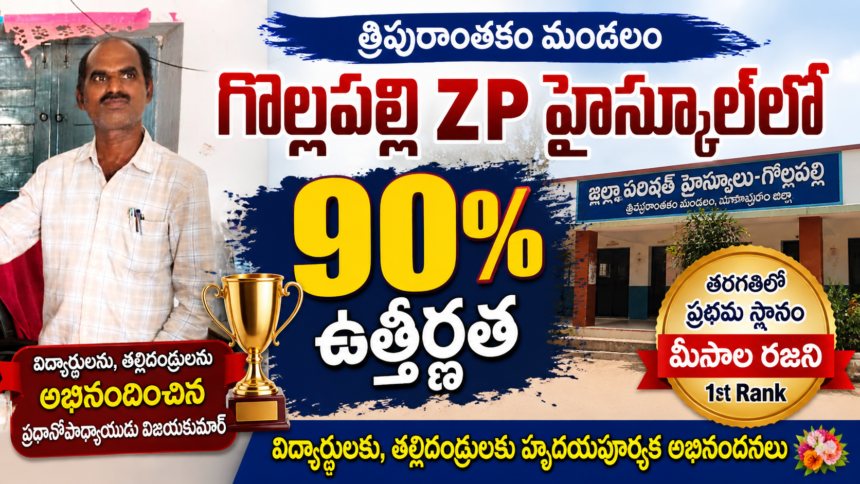 మార్కాపురం జిల్లాలోని త్రిపురాంతకం మండలం గొల్లపల్లి గ్రామంలోని జెడ్పి హైస్కూల్ ఈ ఏడాది ఎస్ఎస్సి ఫలితాల్లో విశేష ప్రతిభ కనబరిచింది. పాఠశాలలో మొత్తం 90 శాతం ఉత్తీర్ణత నమోదు కావడం గర్వకారణంగా నిలిచింది. తరగతిలో మీసాల రజని ప్రథమ స్థానం సాధించి పాఠశాలకు కీర్తి తెచ్చింది. ఈ సందర్భంగా విద్యార్థుల కృషిని అభినందిస్తూ, తల్లిదండ్రులకు ధన్యవాదాలు తెలియజేస్తూ పాఠశాల ప్రధానోపాధ్యాయుడు విజయకుమార్ మాట్లాడుతూ భవిష్యత్తులో ఇంకా మెరుగైన ఫలితాలు సాధించాలని ఆకాంక్షించారు.
