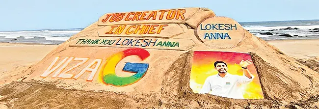 ప్రముఖ శిల్ప కళాకారుడు బాలాజీ వరప్రసాద్ తన నైపుణ్యంతో ఈ సైకత శిల్పాన్ని అత్యంత సుందరంగా తీర్చిదిద్దారు. అందులో “జాబ్ క్రియేటర్ ఇన్ చీఫ్ లోకేశ్ అన్న”, “థ్యాంక్యూ లోకేశ్ అన్న.. వైజాగ్” అని రాసిన అక్షరాలు పర్యాటకులను మంత్రముగ్ధులను చేస్తున్నాయి. ఈ శిల్పంలో మరో విశేషం ఏమిటంటే.. ‘వైజాగ్’లోని చివరి ‘జీ’ అక్షరాన్ని ‘గూగుల్’ లోని మొదటి అక్షరం ప్రతిబింబించేలా కళాత్మకంగా రూపొందించారు.